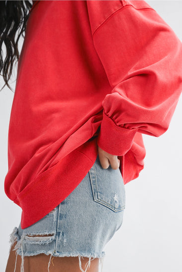 Relaxed oversized fit with a mock neckline. Soft washed fabrication and subtle seam detailing give it a perfectly worn in look. Easy to style with leggings or denim for everyday wear.