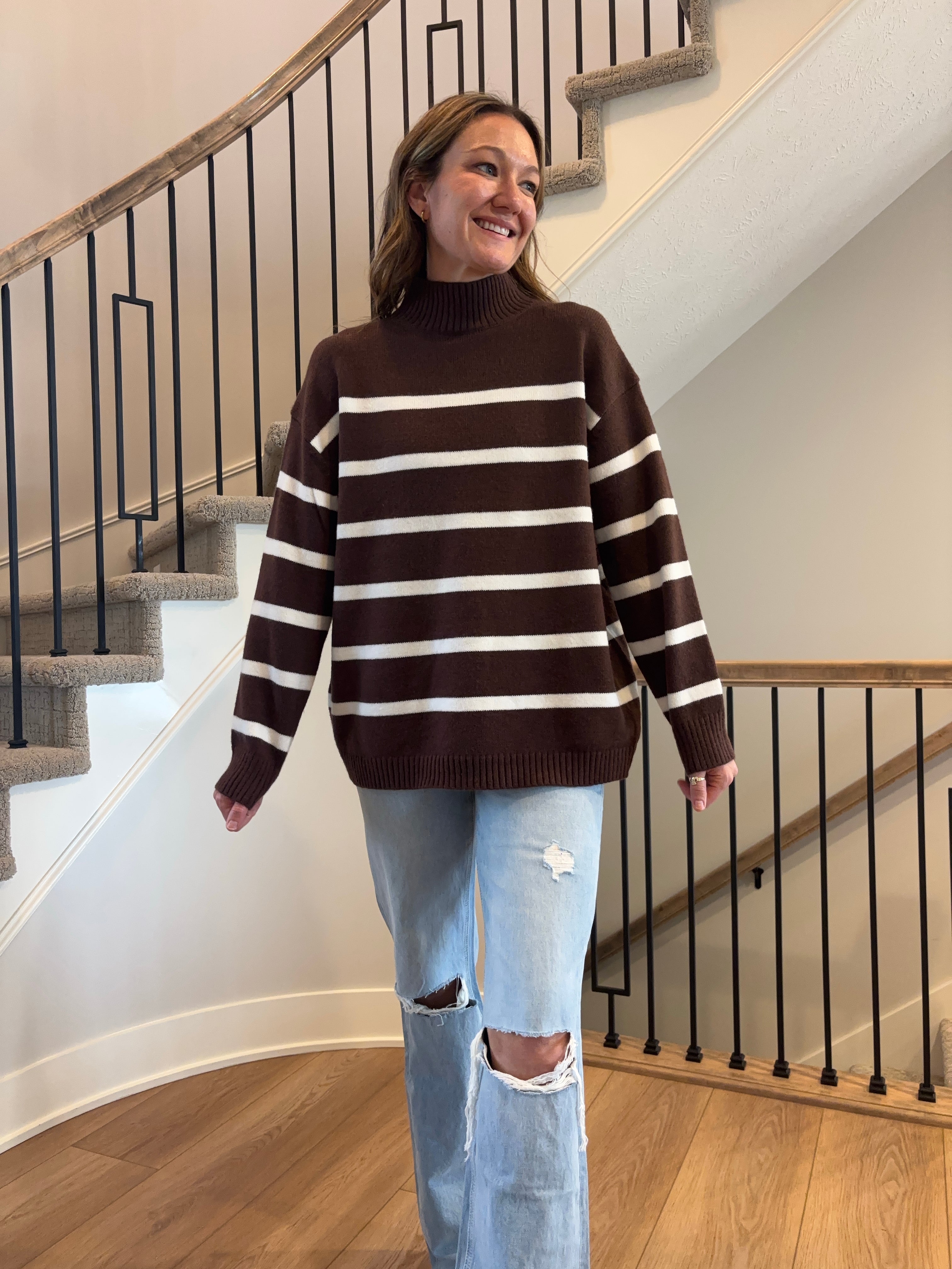 Striped sweater with a high neck, drop shoulders and ribbed edges