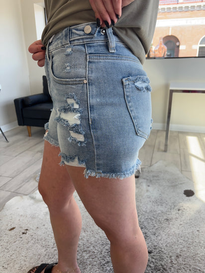 Tummy Control!! High-Rise, ADJUSTABLE waistband! Light Wash Shorts