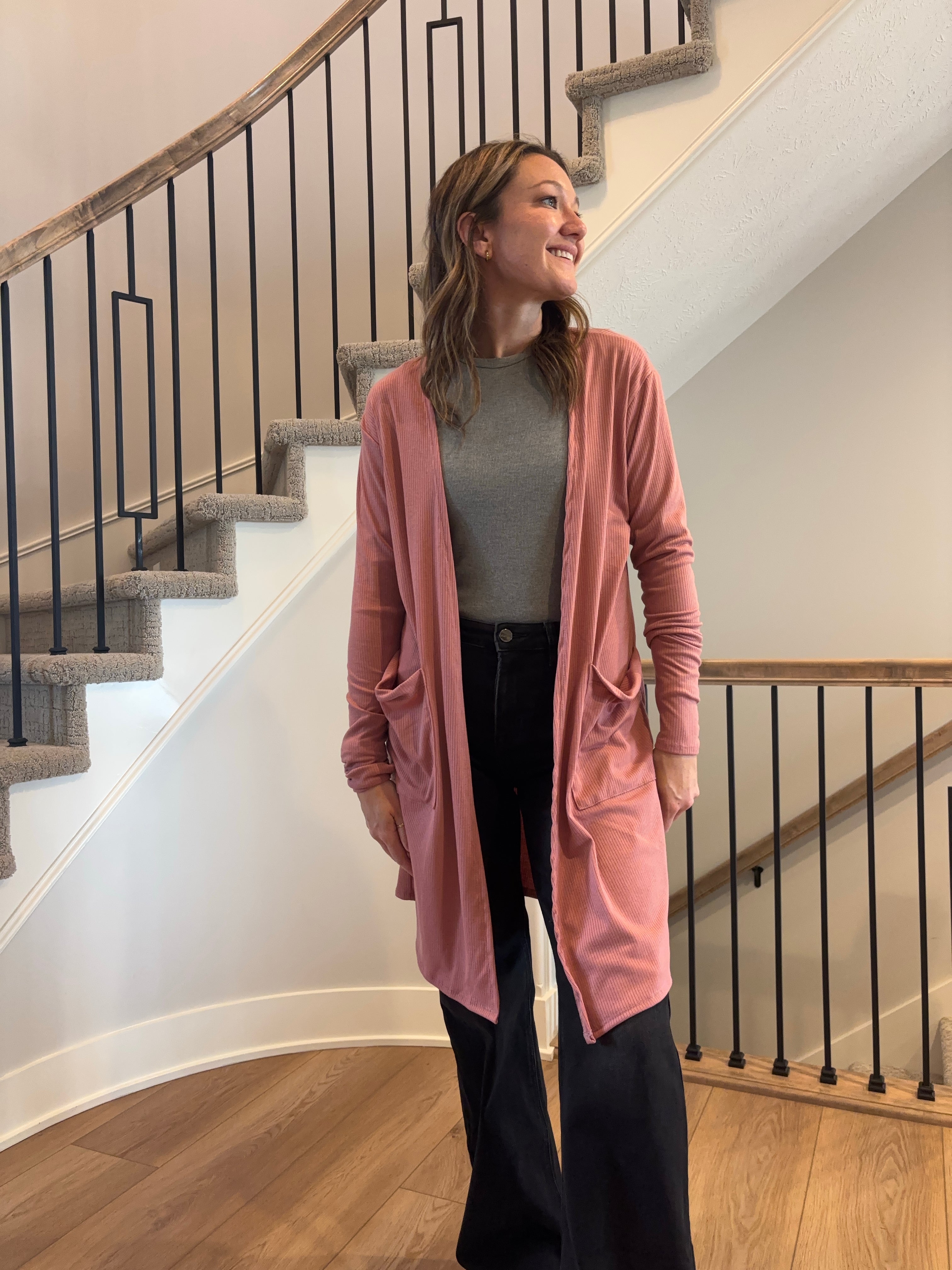 Ribbed cardigan with side pockets and thumb holes!! Perfectly soft, lightweight and stretchy fabric!